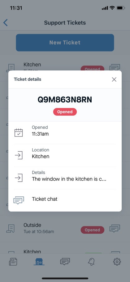 Ticket details – Shows the ticket reference, the status, when it was created, the location of the issue, and the details provided.