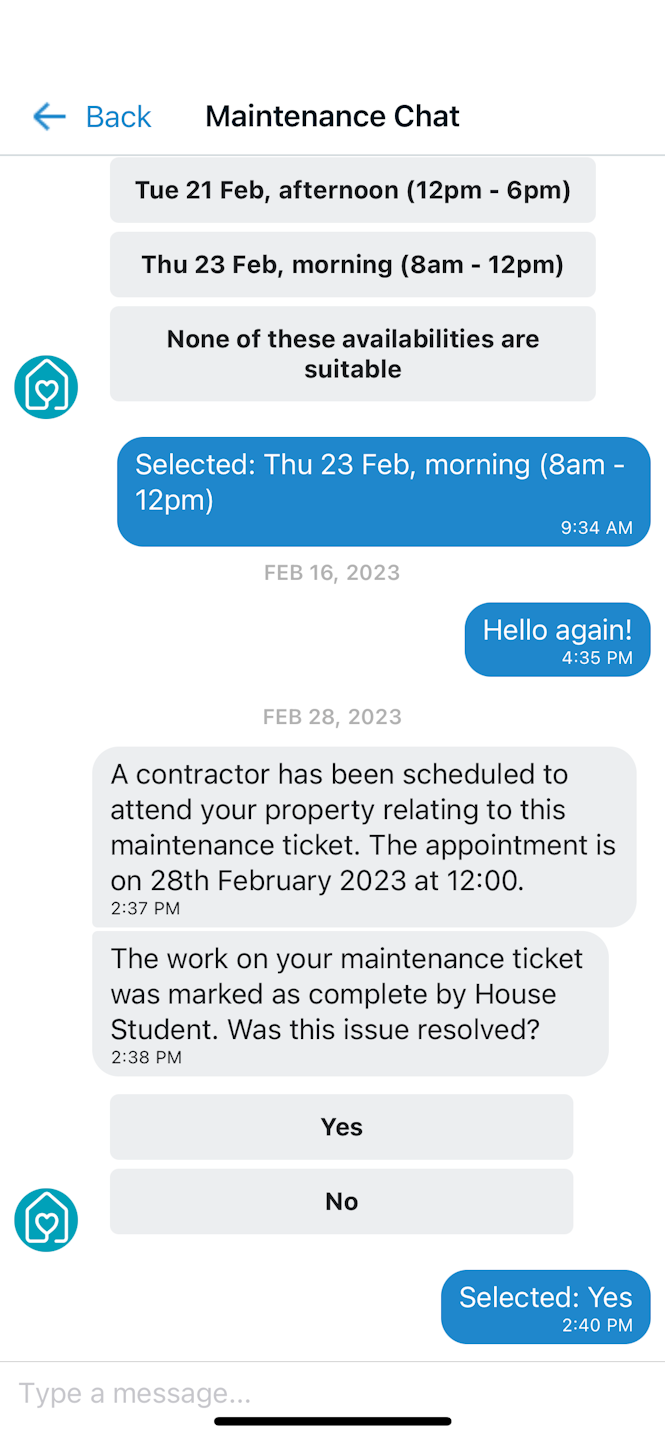 Once the maintenance team dealt with the issue, you will receive a message to confirm if the issue was resolved.